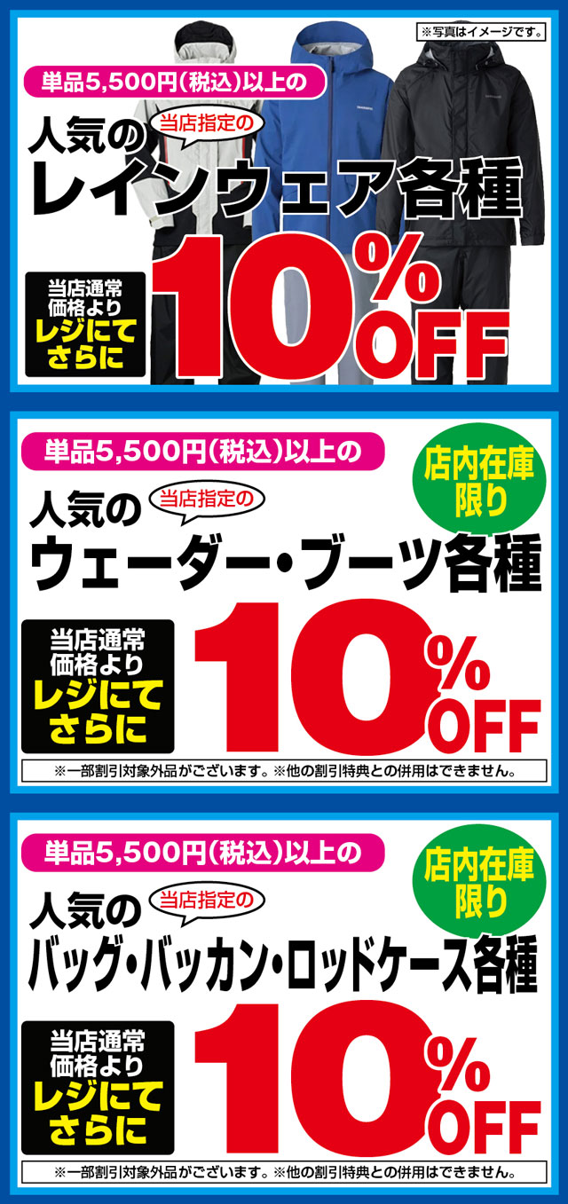 3月13日(木)からのオープンセール期間中、当店指定単品5,500円以上のレインウェア各種、ウェーダー・ブーツ各種、バッグ・バッカン・ロッドケース各種が、店内在庫限り当店通常価格よりレジにてさらに10%OFF!