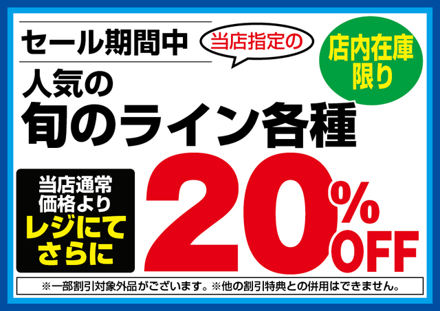 3月13日(木)からのオープンセール期間中、当店指定の旬のライン各種が、当店通常価格よりレジにてさらに20%OFF!