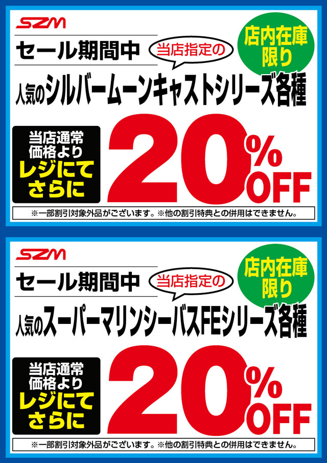 3月13日(木)からのオープンセール期間中、SZMシルバームーンキャストシリーズ各種、スーパーマリンシーバスFE各種が、当店通常価格よりレジにてさらに20%OFF!