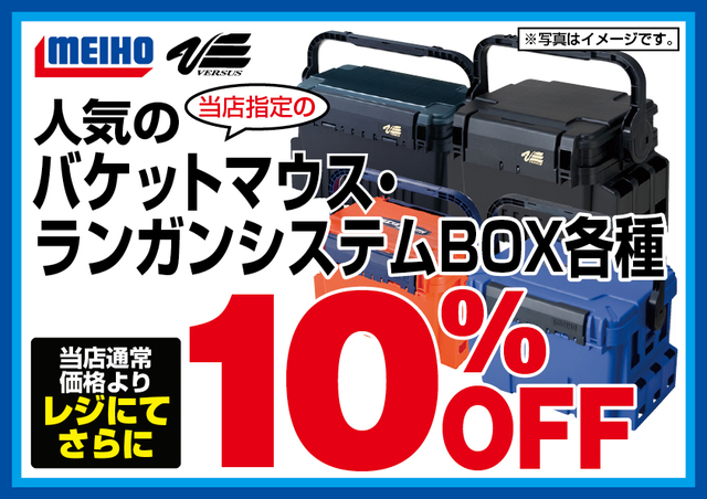 3月13日(木)からのオープンセール期間中、当店指定のMEIHOバケットマウス・VERSUSランガンシステムボックス各種が、当店通常価格よりレジにてさらに10%OFF!