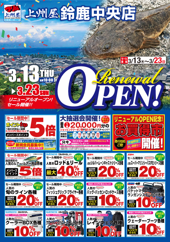 3月13日(木)からのオープンセール期間中、シマノ、ダイワetc.当店指定のロッド&リールが店内在庫限りメーカー希望小売価格より最大40%OFF!!
