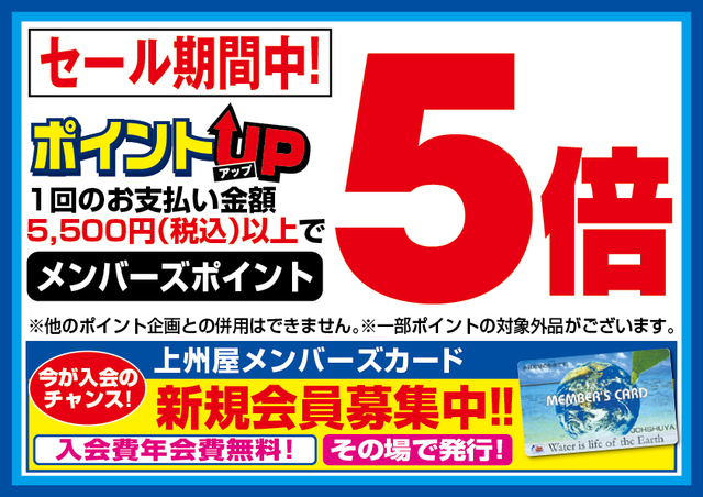 3月13日(木)からのセール期間中、1回のお支払い金額5,500円(税込)以上でメンバーズポイント5倍!