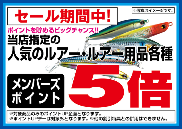 3月13日(木)からのセール期間中、当店指定のルアー・ルアー用品各種が店内在庫限りメンバーズポイント5倍!