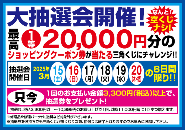 3月15日(土)、16日(日)、17日(月)、18日(火)、19日(水)、20日(木/祝)の6日間限定、最大1等20,000円分のショッピングクーポン券が当たる大抽選会を開催!店内商品1回のお支払い金額税込3,300円以上お買い上げで、三角くじにチャレンジ!