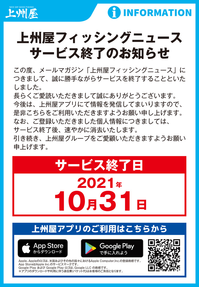 「上州屋フィッシングニュース」につきまして、誠に勝手ながら2021年10月31日をもちましてサービス終了させて頂くことになりました。