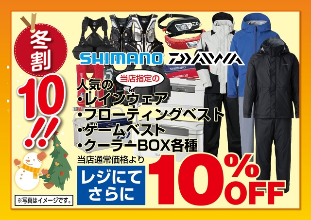 冬割10!!セール期間中、シマノ、ダイワetc.当店指定のレインスーツ各種が当店通常価格よりレジにてさらに10%OFF!
