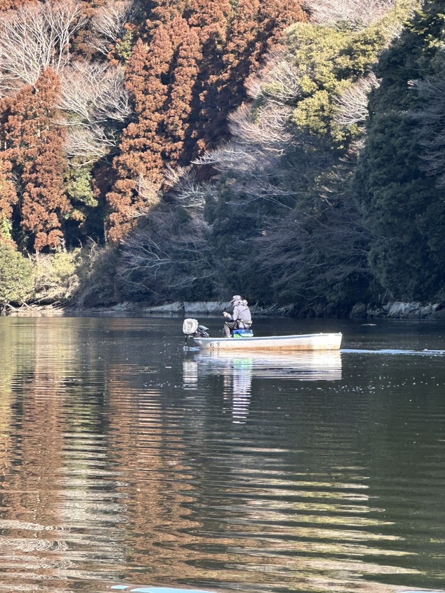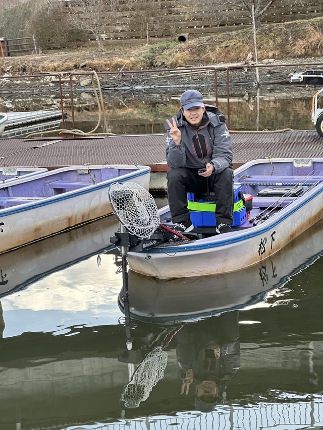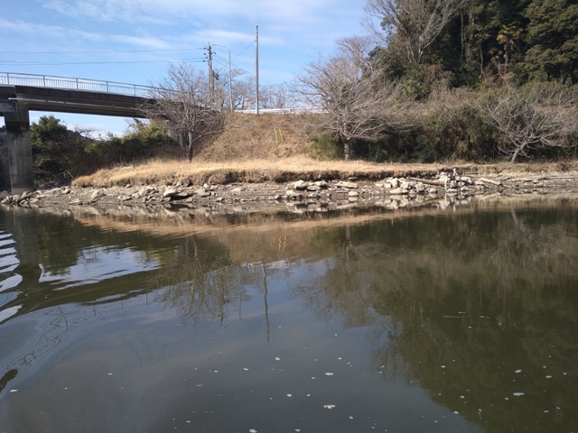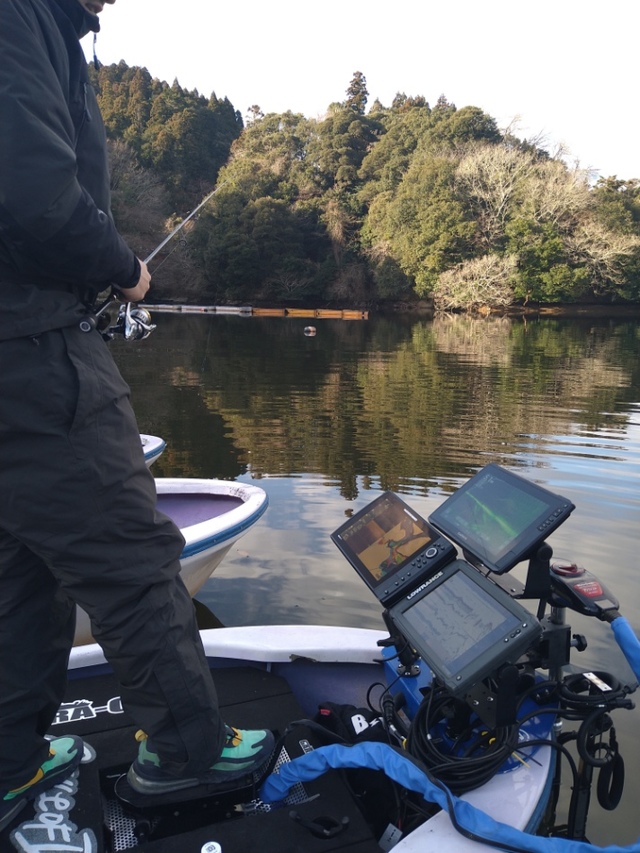 だいぶ減水しているようでこの時期の亀山の減水は珍しいそうで、魚が少しディープに居ると松下ボートさんより教えて頂き、冬の定番ポイントを探っていきますがバイトすらなく終了・・・。キビシイ( ノД`)シクシク…