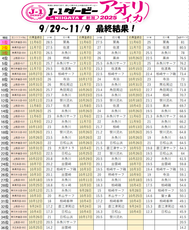J1ダービーアオリイカ2025最終結果!!