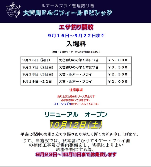 2024/09/23~2024/10/11までポンドの整備の為お休みです。