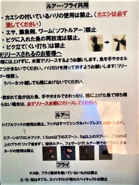 1.8cm以下のスプーン、球状のルアー(イクラ系)、フロントフックのスプーン、フェザージグ、5g以上のルアー、7.1cm以上のミノー、ワーム、イージーフライ、セニョールトルネードは使用禁止です。