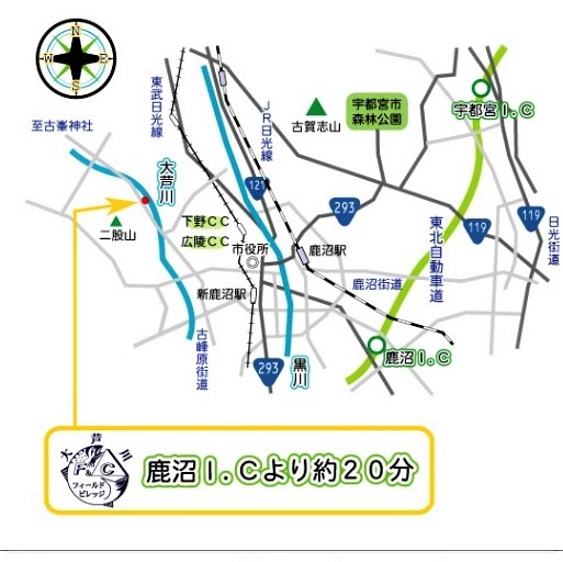 鹿沼I.Cよりスムーズに行けば約20分。国道121号から古峰原街道で古峰神社方面へ。「下沢やな」「大芦F&Cフィールドビレッジ」看板右折、道なりに右カーブ曲がり目的地へ。