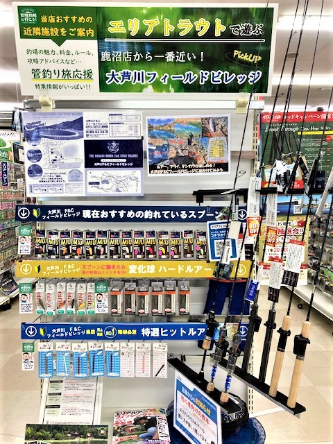 当店では大芦川F&Cフィールドビレッジの特設コーナーを設置し、釣れる道具を多数ご用意しております