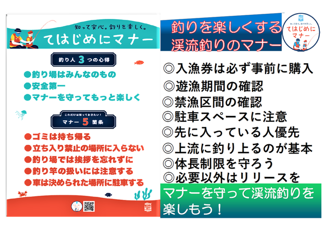 ごみは必ず持ち帰り。釣り人同志の間隔を充分開ける。気持ち良い挨拶で楽しい釣りを!