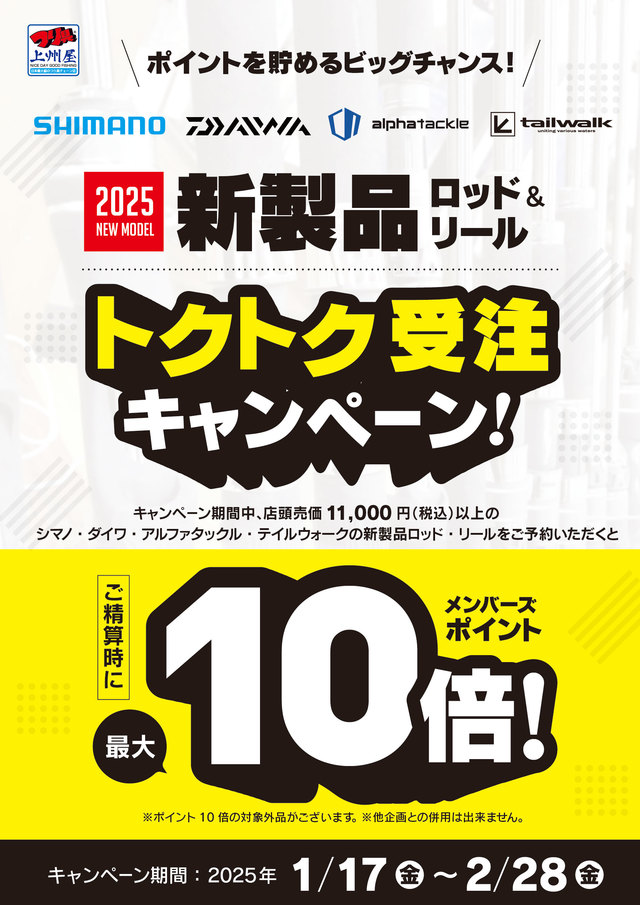 2025年1月20日その他・お知らせ 2025 ダイワカタログ販売中です! 横浜で開かれていた釣りフェスティバル2025大盛況でしたね!気になる新商品もたくさん展示されていました!ダイワ 総合カタログ税込220円で販売中です! 出典: 上州屋からのお知らせ ・会員証機能を搭載!お買い物や釣りの準備がもっと便利になる上州屋“公式”アプリ登場!・【上州屋メンバーズカード】毎月5の付く日と30日(5日、15日、25日、30日)はポイントアップデー!