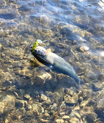 風が強いので、重めのジキルB3.5gミルクココアをボトムまで落とし巻いて止めてでボトムから離れない様に巻くと、良型のレインボーが連続でHIT!