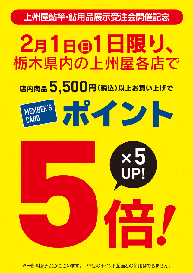 2026年1月19日セール・イベント 2月1日は鮎展示受注会でポイントもお得な日に! -上州屋鮎竿·鮎用品展示受注会開催記念- 宇都宮市のろまんちっく村で同日行われるイベントを記念して、 2月1日(日)1日限り、 当店の店内商品を 5,500円(税込)以上お買い上げで MEMBER'Sポイント5倍進呈! もちろん鮎ジャンル以外でもポイントアップします! ※一部対象外品がございます。※他のポイント企画との併用はできません。 出典: 上州屋からのお知らせ ・会員証機能を搭載!お買い物や釣りの準備がもっと便利になる上州屋“公式”アプリ登場!・【上州屋メンバーズカード】毎月5の付く日と30日(5日、15日、25日、30日)はポイントアップデー!