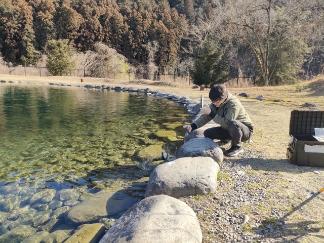この時期の大芦は魚の量も多く、見渡す限りのトラウトでいっぱいです