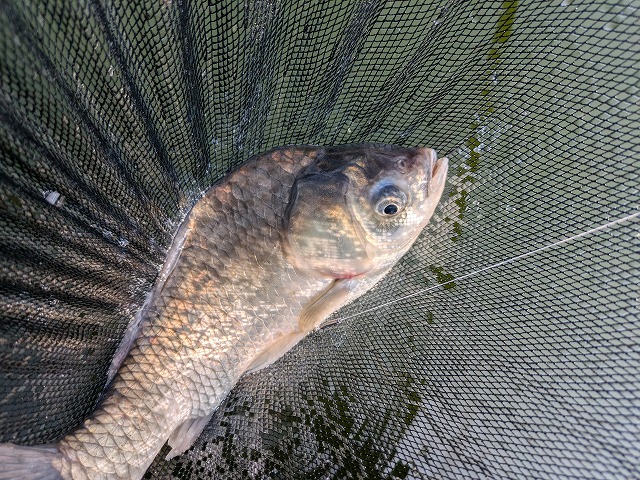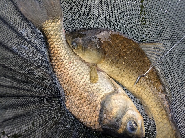 今回のエサはダンゴの底夏1にカクシン2・浅ダナ一本1で〆た重さがあり芯残りのするエサと、グルバラ2・浅ダナ一本2で練り込み戻してからダンゴの底釣り夏1で軽く混ぜて折り畳んで使用したエサの2種を使用しました。