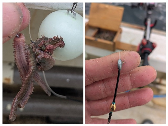 今回使用した仕掛けとタックルです。(ガチガチのカワハギ竿に小型両軸PE1.5号)
