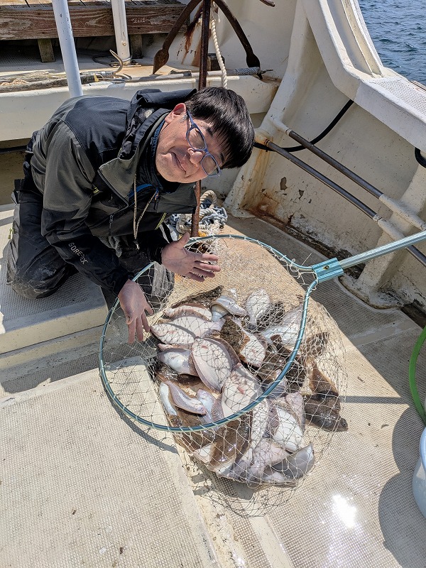 今は湾内の50~60m前後のポイントが主ですが これからもっと浅場で良型のマコガレイが釣れだします!