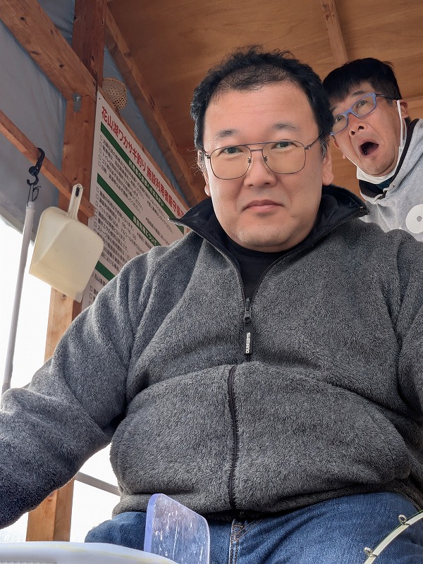 お二人はワカサギの魚信を必死にとらえます。