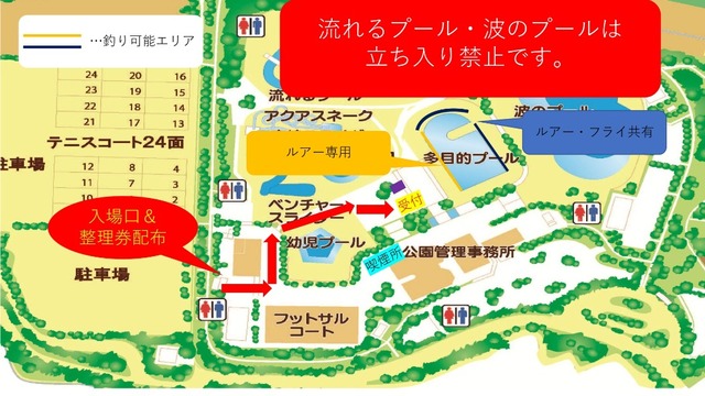 今シーズンは流れるプールと波のプールが休止となる川越水上公園。多目的プールのみの営業の為、午前午後40名ずつの抽選入場になります。5:45と11:45から整理券配布です。テント側がフラフィッシング可能なエリアとなります。