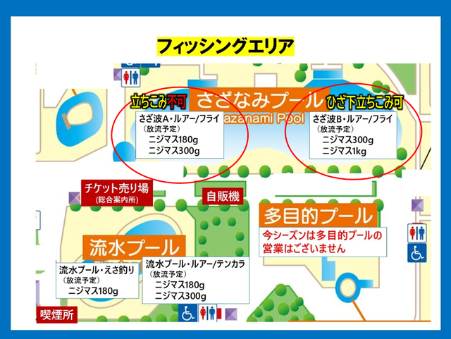 今年は多目的プールの営業が休止になります。その分さざなみプールは両側営業です。入場口から手前側のさざなみAは立ちこみ不可となっている為、昨年まで多目的プールで楽しんでいたアングラーはコチラがおススメ。フライを中心としたウェーディングスタイルの方は奥のさざなみBが立ちこみ可能になっています。ちなみに月曜定休が廃止されましたので他公園同様お休みは12月31日と1月1日のみとなっています。