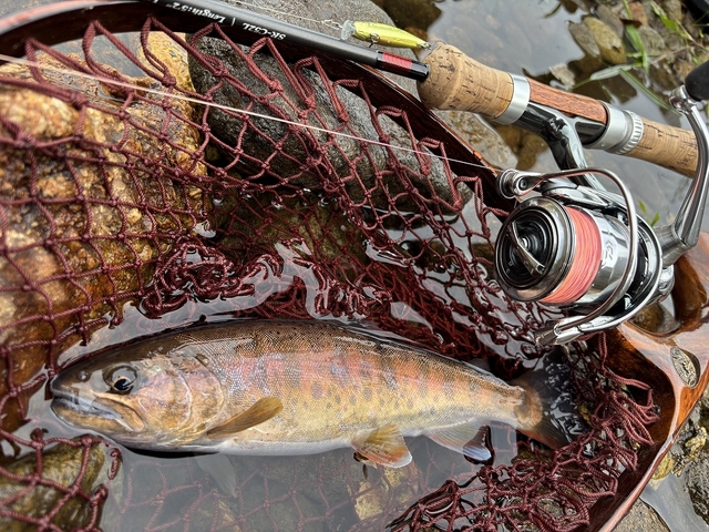 遡行していくと、ある程度水深のあるポイントでは小さいヤマメが遊んでくれました。良型サイズになるとルアーへの反応が渋くなりチェイスしてもUターンの連続(汗