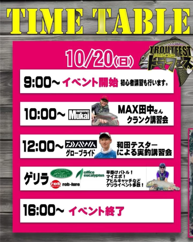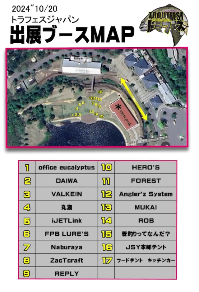 参加メーカー:アングラーズシステム・DAIWA・フォレスト・FPBルアーズ・ヒーローズ・アイジェットリンク・ムカイフィッシング・なぶら家・オフィスユーカリ・リプライ・ロブルアー・ヴァルケイン・ザクトクラフト・丸湖・管釣りってなんだ!?
