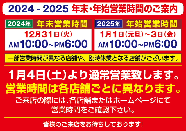 当店は1月4日(土)より、通常営業時間(AM10:00~PM8:00)に戻ります。