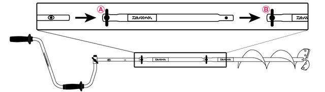 ①延長キットに付いているネジ(A)とアイスドリルに付いているネジ(B)を外し、上図のように差し込む