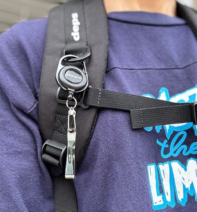 フィッシングベストやバッグなどにワンタッチで取り付けができるカラビナタイプのピンオンリール。