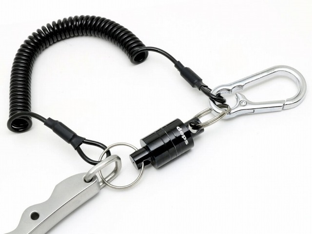 フィッシングベストやバッグなどにワンタッチで取り付けができるカラビナが付いたマグネットコード。