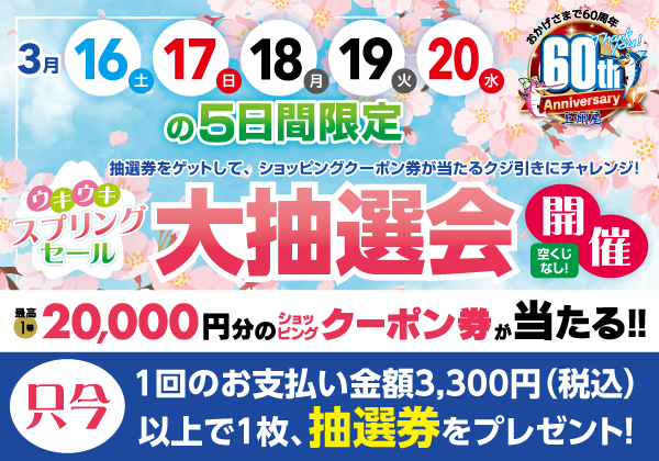 2月29日(木)より店内1回の支払い金額税込3,300円以上お買い上げで、3月16日(土)、17日(日)、18日(月)、19日(火)、20日(水/祝)の5日間開催、ウキウキスプリング大抽選会に参加いただける抽選券をプレゼント!最大1等20,000円分のショッピングクーポン券が当たるチャンス!空クジなし!