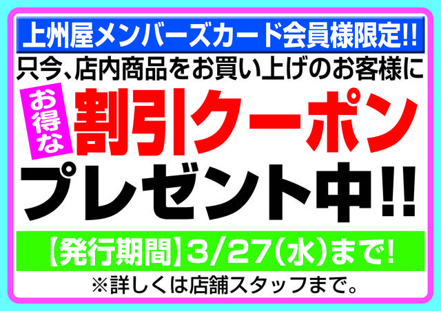 上州屋メンバーズカード会員様限定!2月29日(木)より店内商品をお買い上げのメンバーズカード会員様に、レジにてお得な割引クーポンプレゼント!発行期間は3月27日(水)まで!