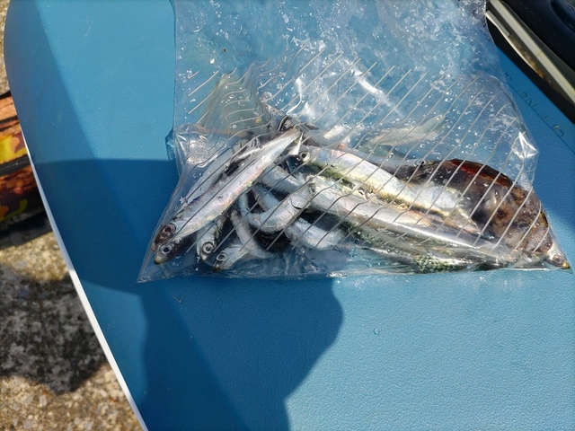 本日のうみかぜ公園横岸壁ではイワシや小サバがサビキで釣れていました