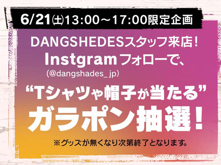 DANG SHADESスタッフ在店時間限定InstagramフォローでTシャツや帽子が当たるガラポン抽選に参加出来ます。