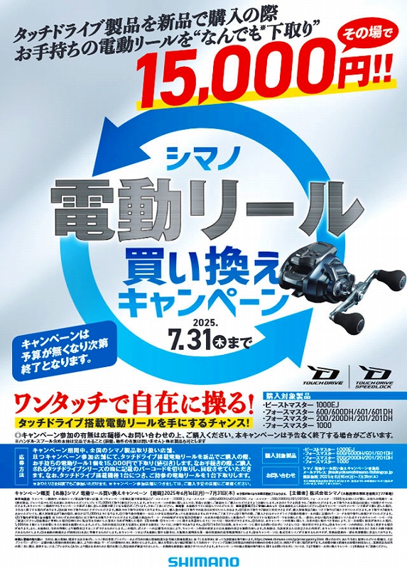 7月6日まではロッド・リールがお買い♪シマノの電動リール買い替えキャンペーンも是非ご利用下さいませ。