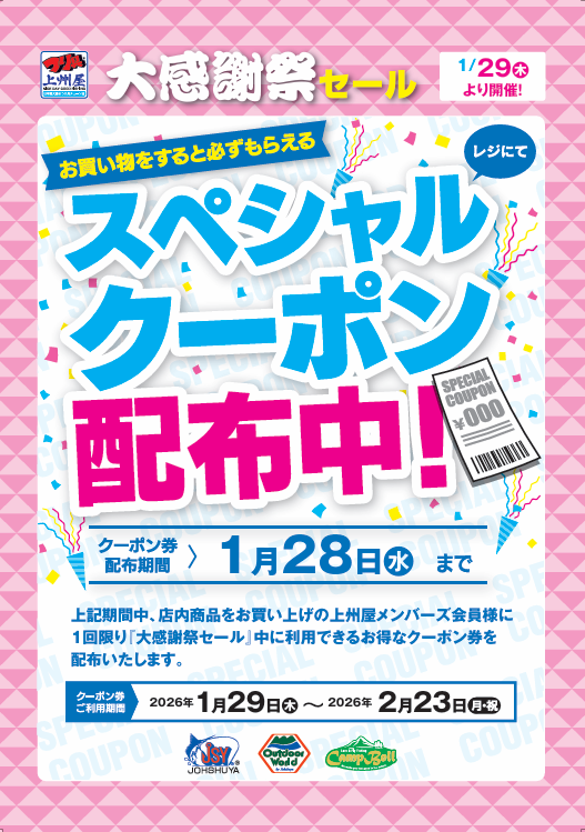 期間中にお買い上げのメンバーズカード会員様に1回限り大感謝祭セール中に利用できるお得なクーポン券を配布致します。