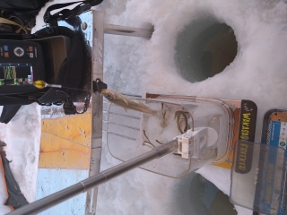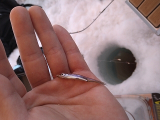 穴を覗きながら誘うとワカサギのバイトシーンが見えるくらいド表層にワカサギ