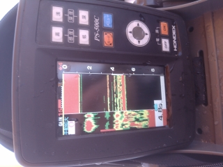 底付近でポツンポツンと当たりますが魚影の映りからするとなんかイマイチ・・・
