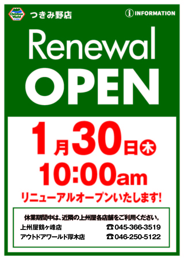 他店舗情報! アウトドアワールドつきみ野店がリニューアルします。