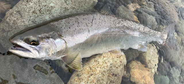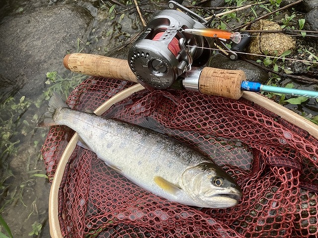 余笹川との合流から下流部では一気に川幅が広がり、7ft前後の本流用ロッドではないと対応が難しくなってきます。スプーンでは6g~12g程、ミノーでは6cm~9cmクラスの本流用ルアーを主に使います。魚種は本流ということもあって、尺以上の戻りヤマメやサクラマス、居つきの大イワナ・ニジマスなどなど・・・多種多様な魚種がターゲットになります。急瀬・トロ場・大淵といった本流ならではのポイントが点在し、1発大物が狙えます。