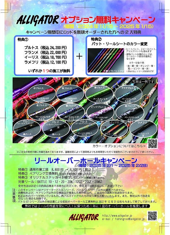 なんと今回よりバット・リールシートカラーの変更(無料)が可能になりました♪どうぞこのチャンスをお見逃しなく!!