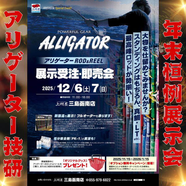 本日・明後日開催!! 12/7(土)・12/8(日)アリゲーター年末グラスワンピースロッド展示受注会開催のお知らせ