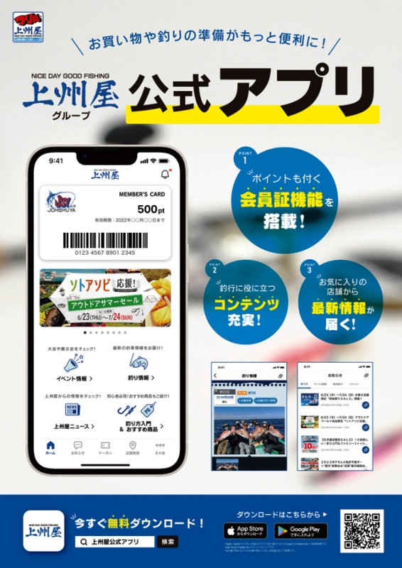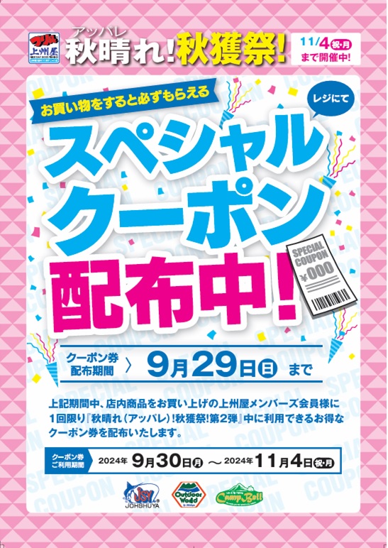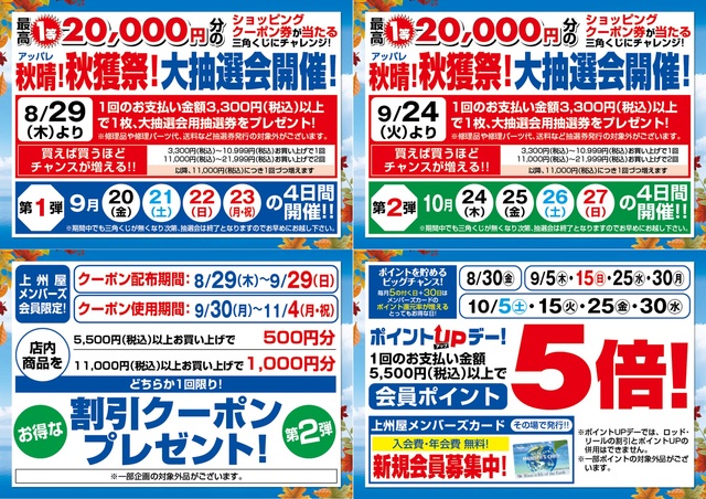 店内商品5,500円(税込み)以上のお買い物で、上州屋メンバーズカードのポイントが