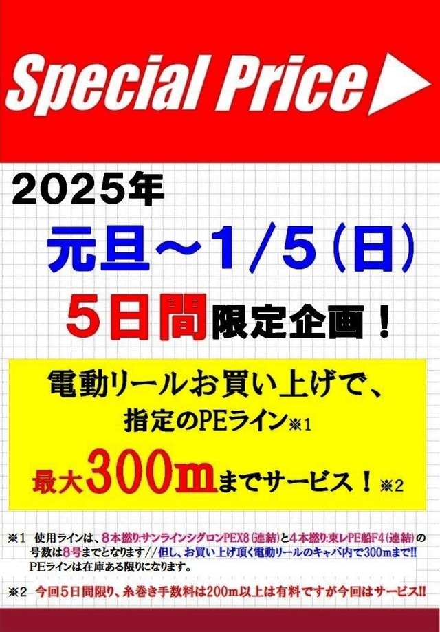 指定のPEライン最大300mまでサービス!