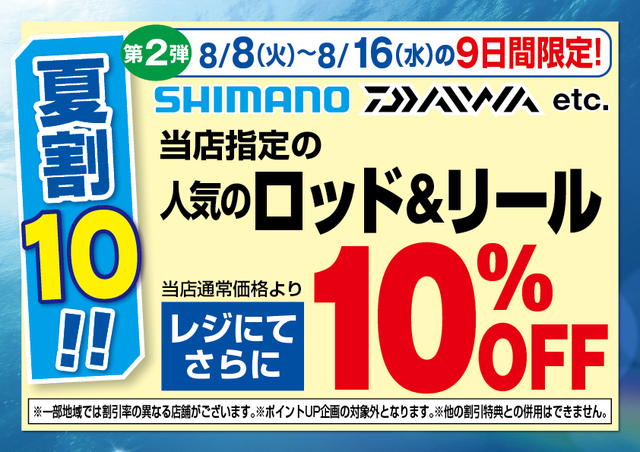 2023年8月16日セール・イベント “夏得!ガッ釣りセール”本日最終日! 【夏得!ガッ釣りセール】も本日が最終日となります! 出典: シマノ、DAIWAなど当店指定のロッド&リールが当店通常価格よりレジにてさらに10%OFF!こちらも本日が最終日です!本日の営業は9時までです! 上州屋からのお知らせ ・会員証機能を搭載!お買い物や釣りの準備がもっと便利になる上州屋“公式”アプリ登場!・【上州屋メンバーズカード】毎月5の付く日と30日(5日、15日、25日、30日)はポイントアップデー!
