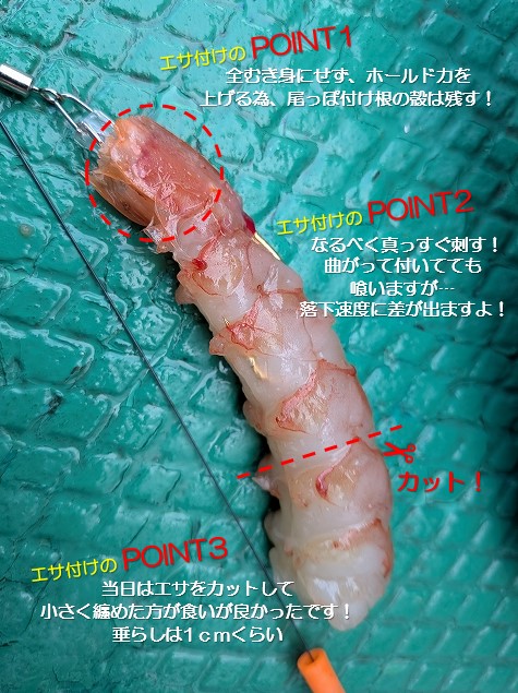 そしてボリュームを抑えたエビのサイズ!エサのボリュームを抑える事で、指示ダナまで早めの到達が可能!
