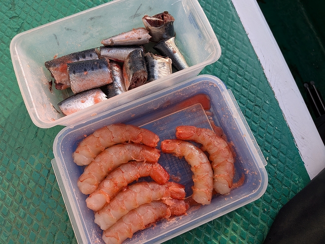「アルゼンチン赤エビ」+「イワシ」(エビは10匹、イワシはぶつ切りで10個用意)